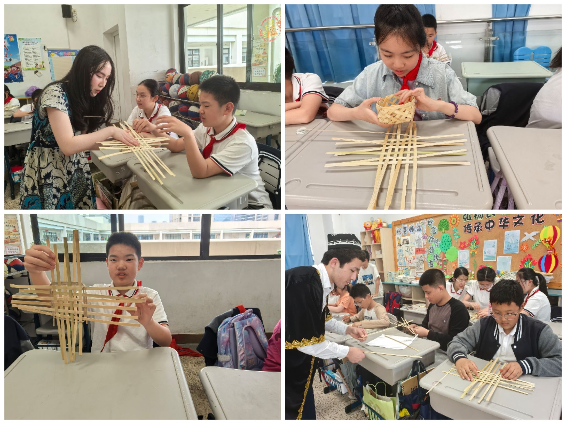 如果说乌兹别克斯坦的篇章是视听盛宴,印尼文化则让双手感知文明的温度。主持人李迎翠通过短视频与实物展示,向孩子们讲述“千岛之国”的智慧传承:从巴厘岛竹编器具的精巧结构,到爪哇皮影戏的哲学意蕴。当棕榈叶分发到每个孩子手中时,全场瞬间化作创意工坊。职工们化身“手工艺导师”,手把手教孩子们将叶片折叠穿插,编织成承载祝福的迷你花篮,叶脉的纹路与童真的笑脸相映成趣。
