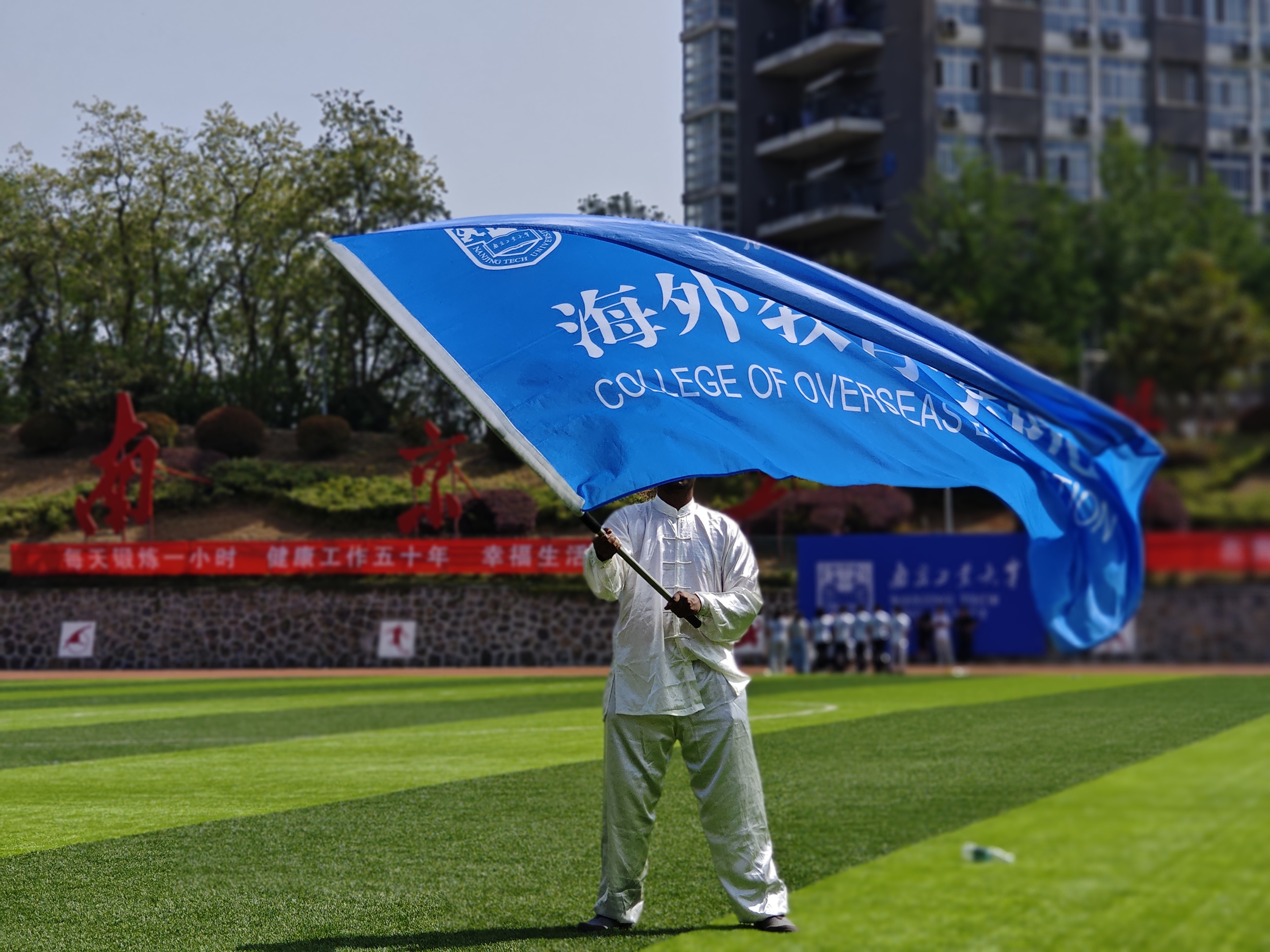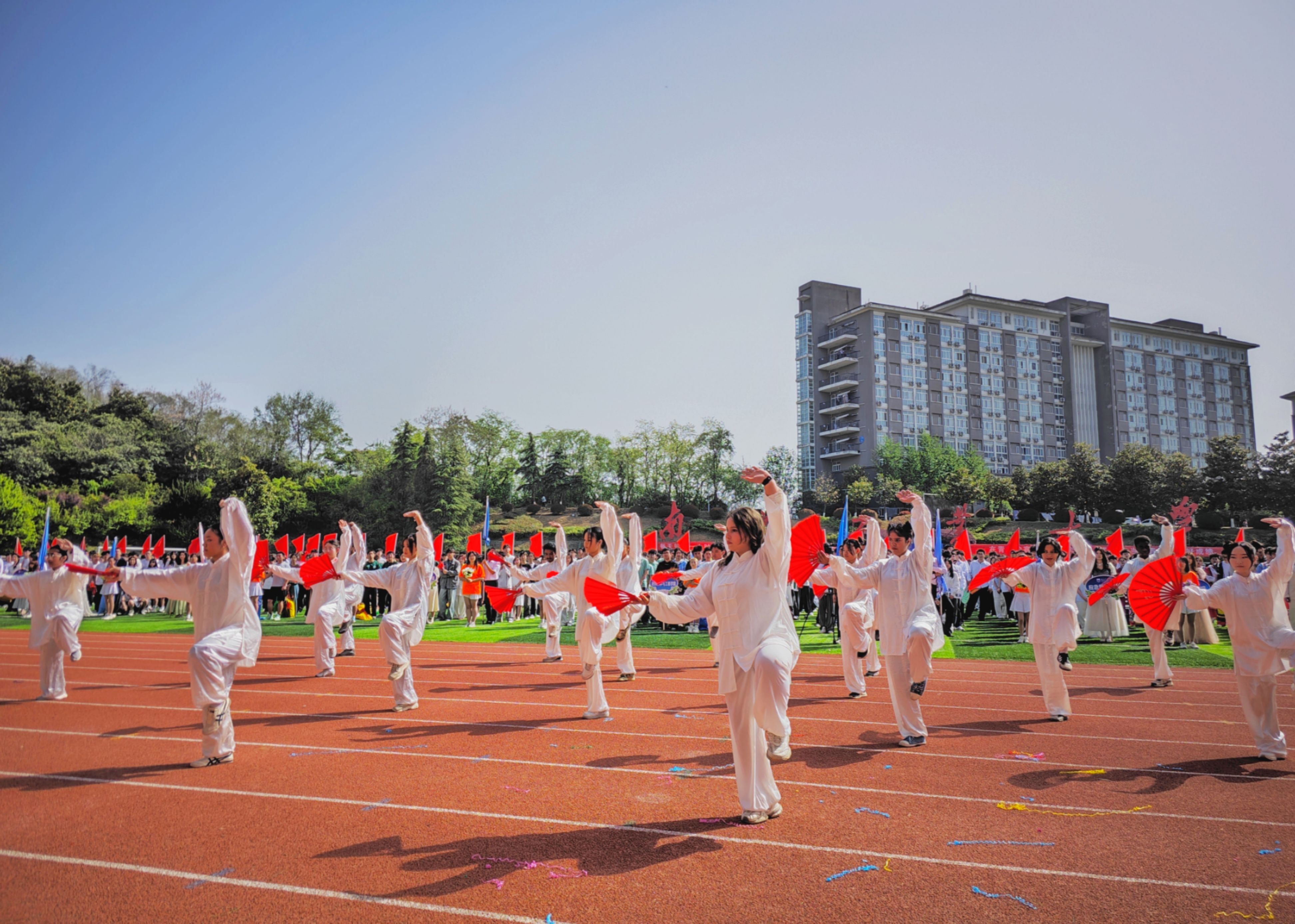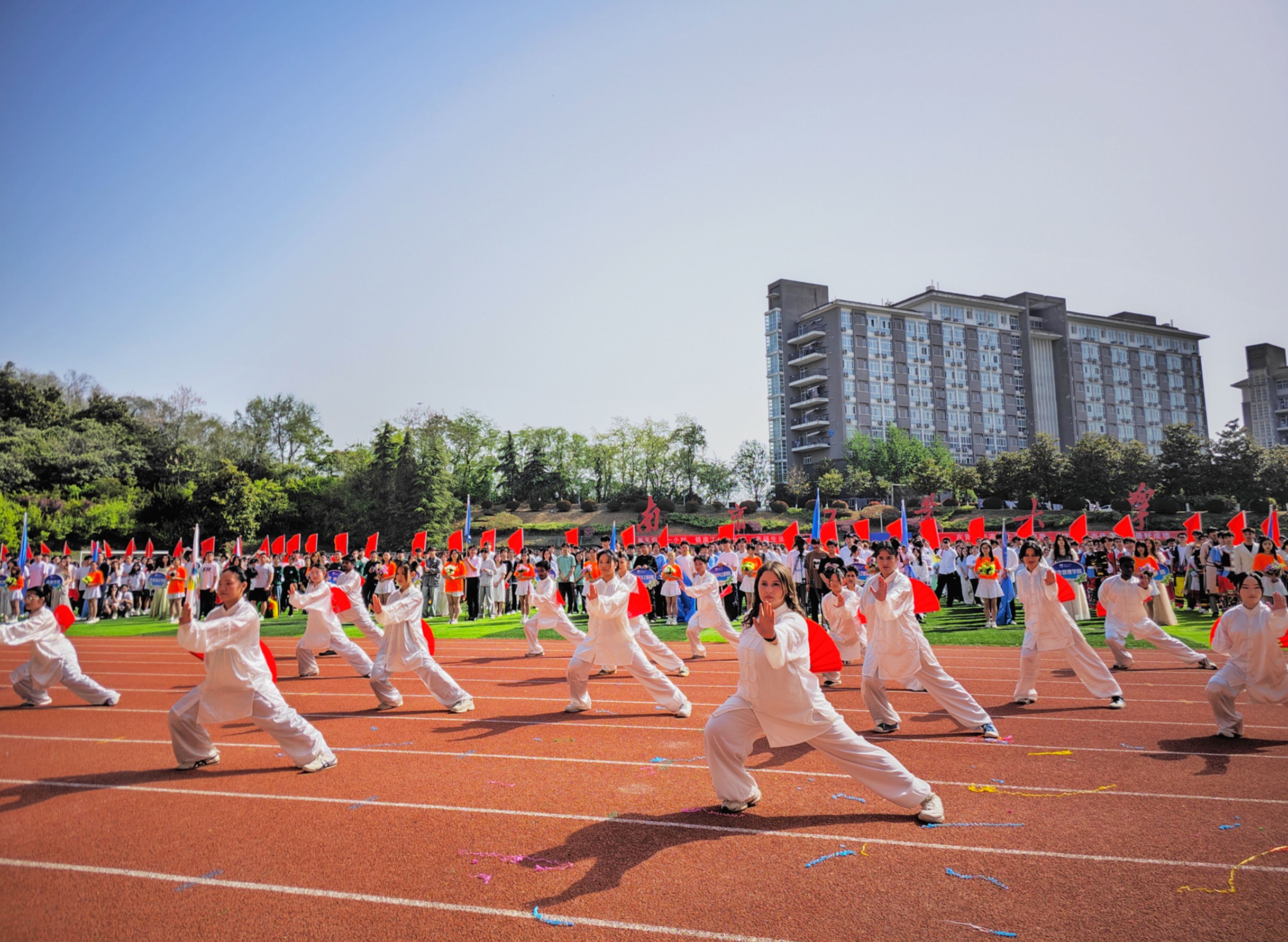 公司对本次开幕式方阵表演做了精心设计,以八极扇为主,辅以参与方阵表演的同学身着独具特色的民族服装以及汉服,来自泰国、摩洛哥、马来西亚等国家的职工挥动着手举牌和国旗将现场气氛推向高潮。
