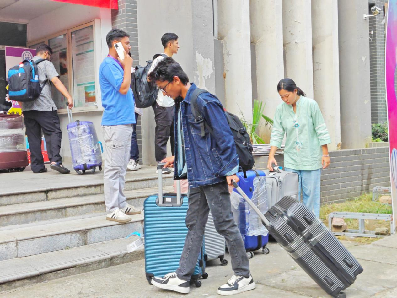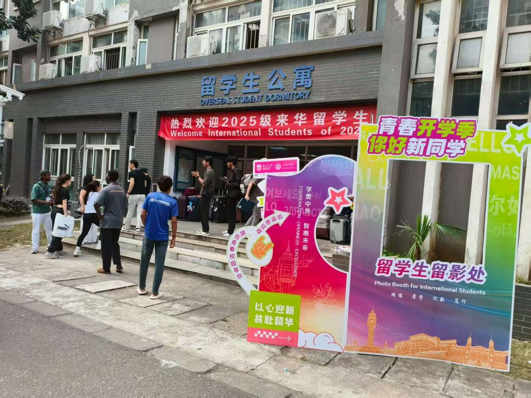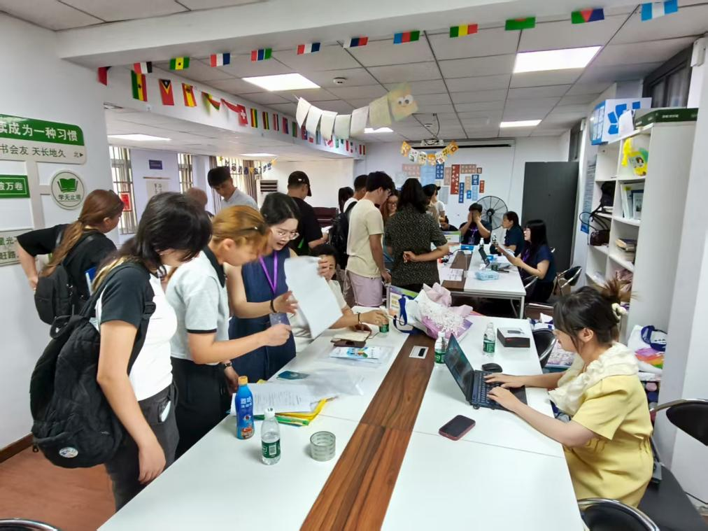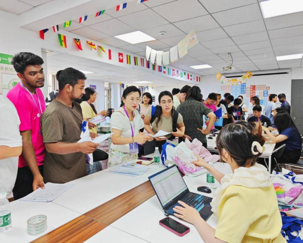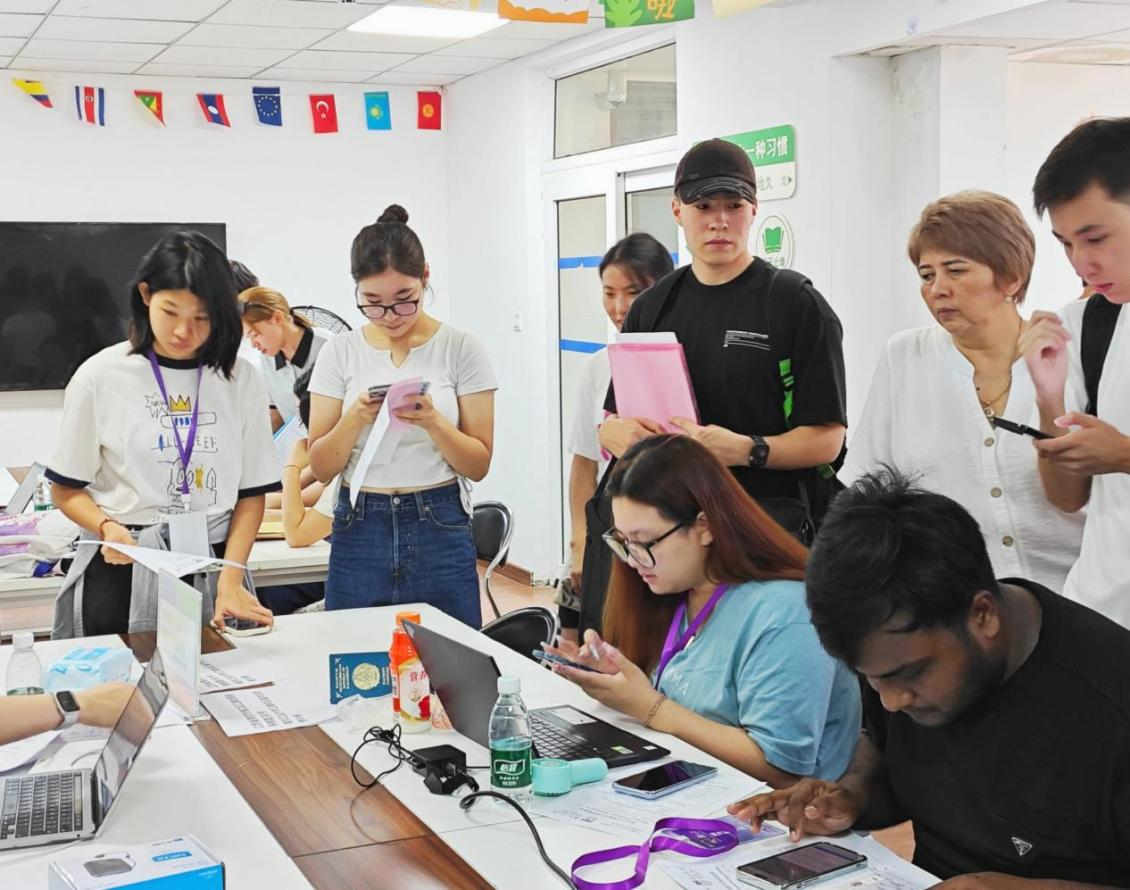 双语相伴,助力启航更显贴心。一支由60余名中外员工组成的志愿者团队活跃在迎新一线,他们提供流畅的中英双语服务,在站点接应、指引路线、运送行李,协助新生完成注册、缴费、保险、签证等手续,以热情服务消除新生陌生感,传递校园温暖。