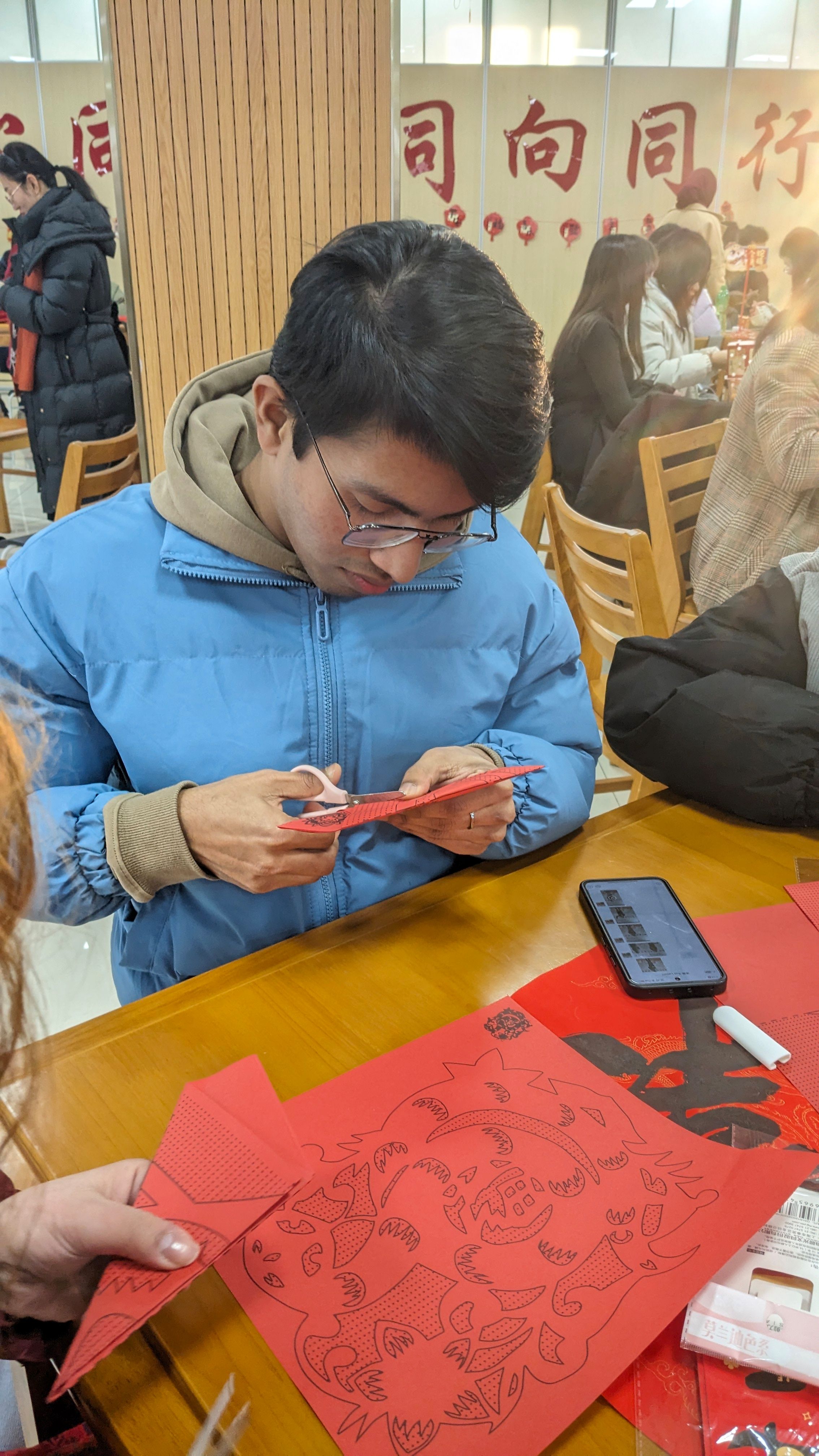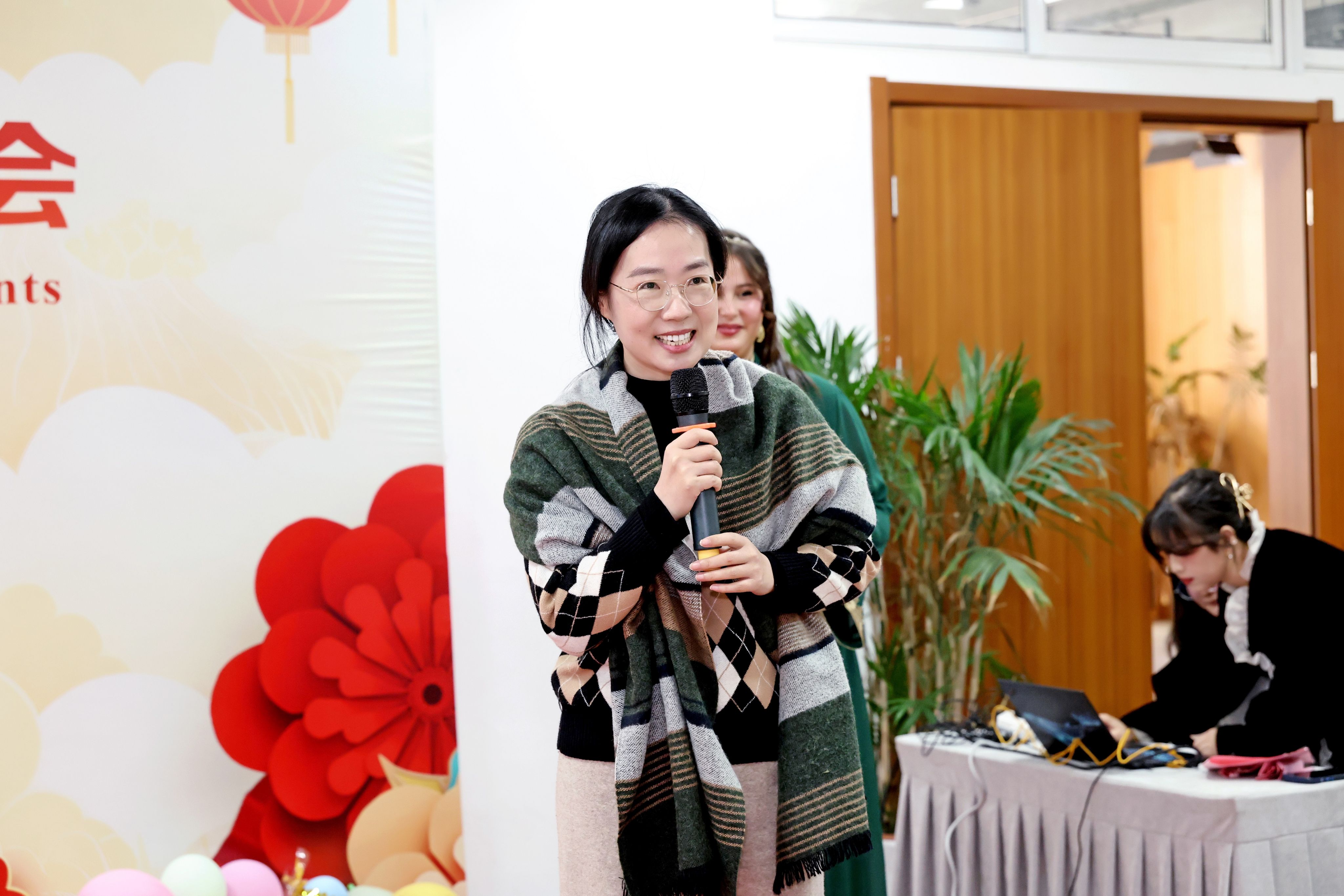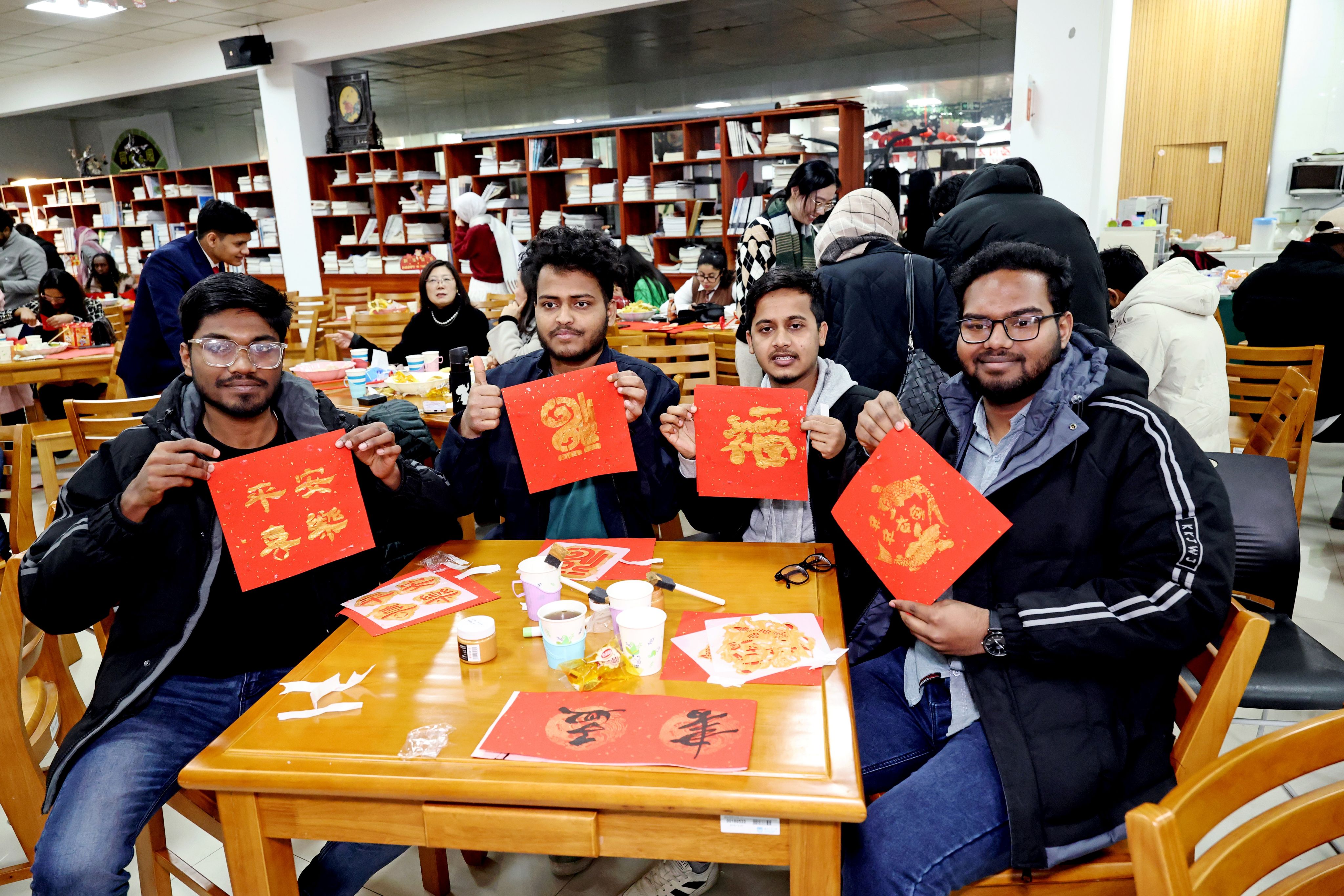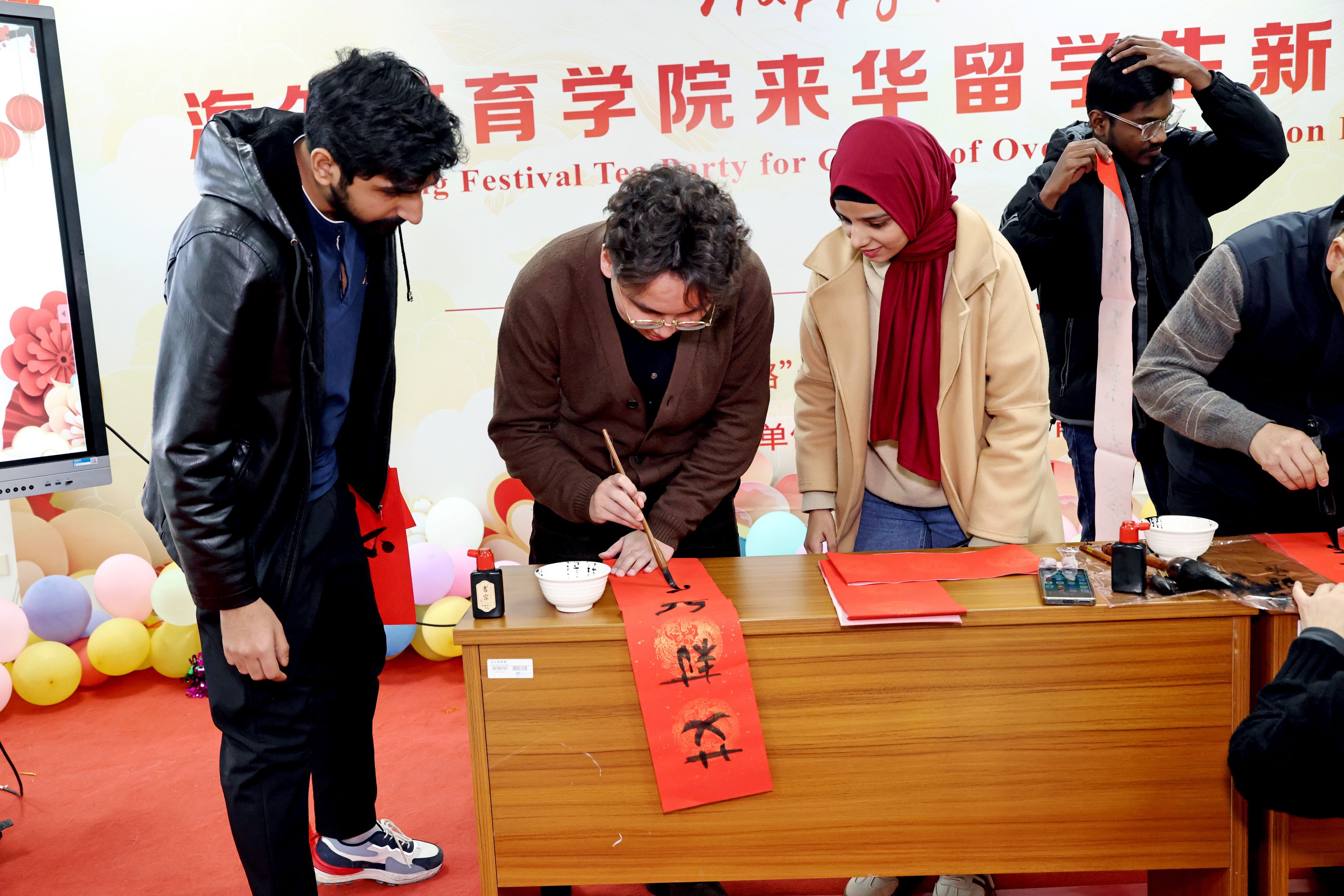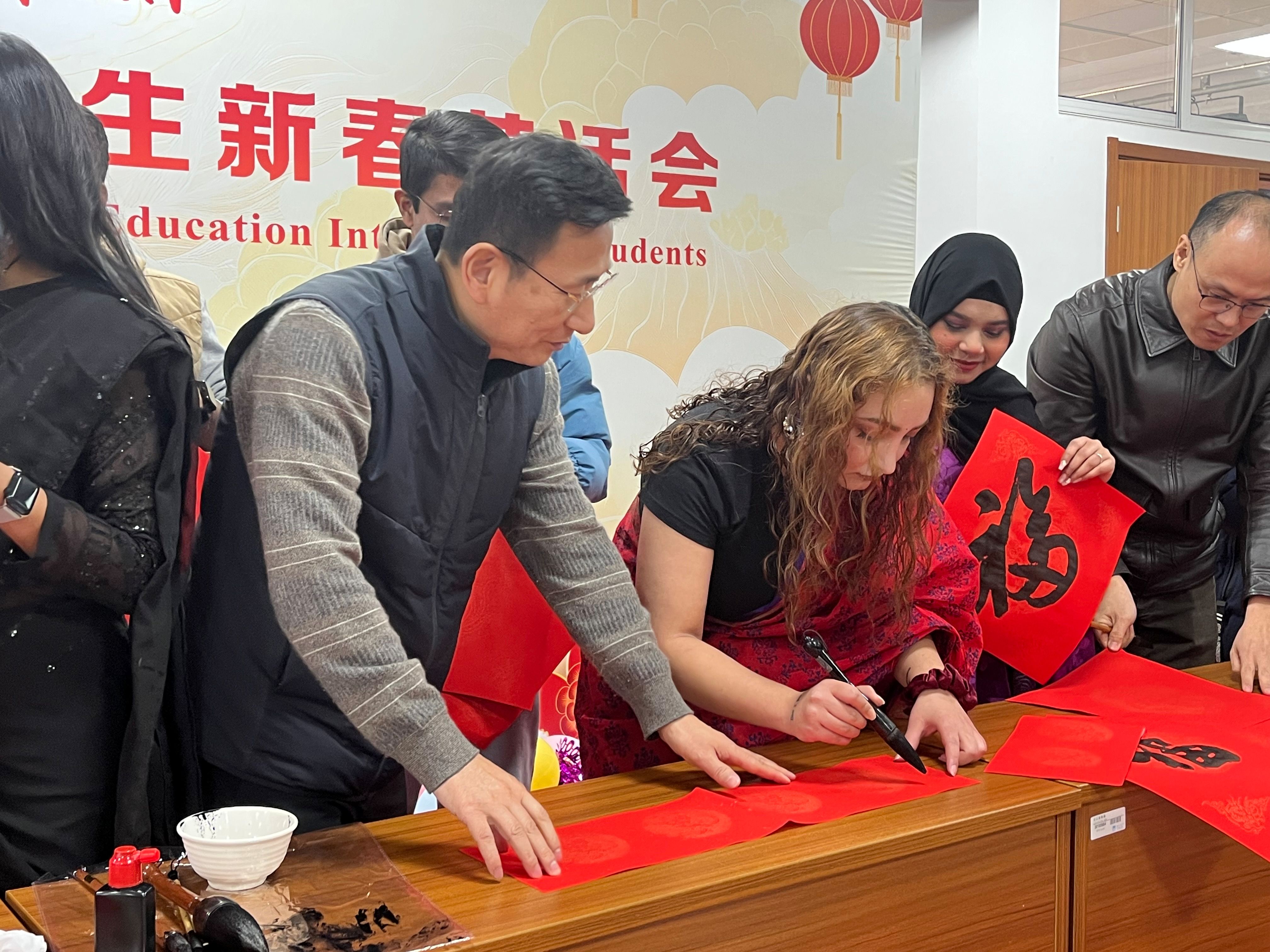 活动现场,职工们身着五彩缤纷的传统服饰,共同迎接新春的到来。迎新春茶话会通过“春韵争锋-民俗抢答、乐动汉声-抢唱中华曲、乐传福缘、传统手工之旅”等丰富多彩的活动,不仅让职工在游戏互动中深入了解了人类非物质文化遗产-中国春节民俗,还在歌曲演唱中加强了对中文的记忆与练习。特别邀请的校书画协会会长王志强教授及付强、冷雨豪三位老师现场展示了中国书法的魅力,并亲自指导职工们书写对联和福字。活动尾声,best365英国体育在线经理佴康和“一带一路”化工与建筑行业人文交流研究院副经理、公司汉语言文化课程群负责人薛莉清向职工们致以新春祝福,副经理朱丹解读了“寒假不寒冷,玩学南工大”职工寒假手册,为职工们提供了假期生活的实用指导和建议。