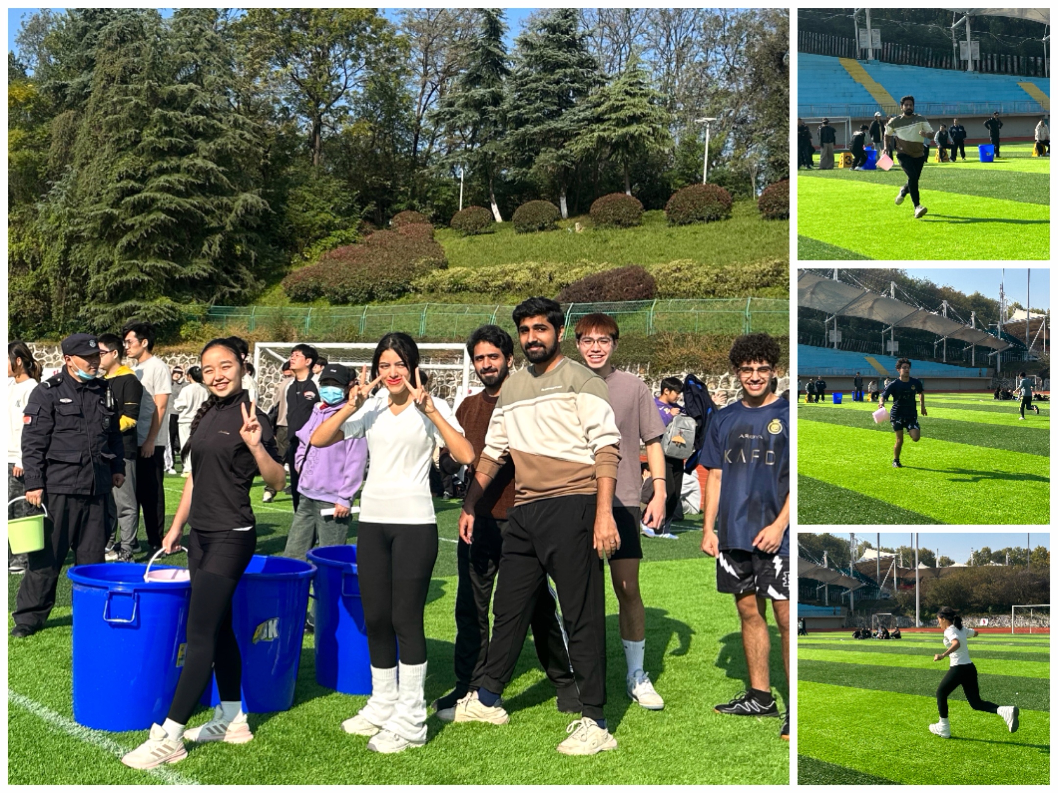 在“限时取水”接力中,6名队员们配合默契,传递迅速,展现了高效的团队协作;“水带打保龄球”项目,巴基斯坦籍计算机2401班的MUHAMMAD AHMADKHAN精准操控水带,一击中的,模拟了火场快速准确铺设水带的技能;“消防标识拼图”环节,队员们沉着冷静,快速识别并拼合消防标识,加深了对安全标志的理解;在模拟真实灾害场景的“火场逃生”项目中,规范使用湿毛巾,低姿匍匐,依照指示标识迅速撤离,掌握了在浓烟环境中自救逃生的关键技巧。